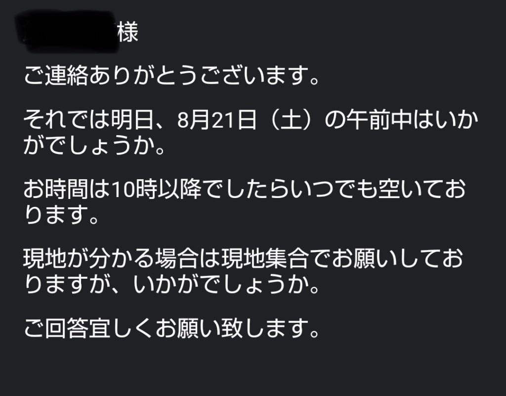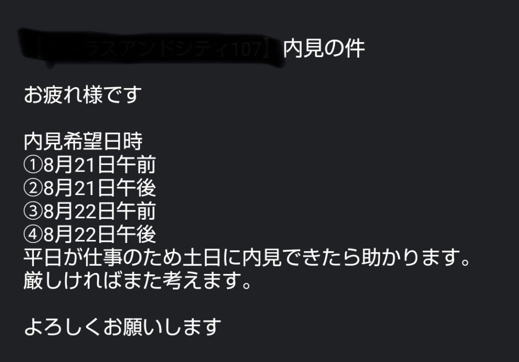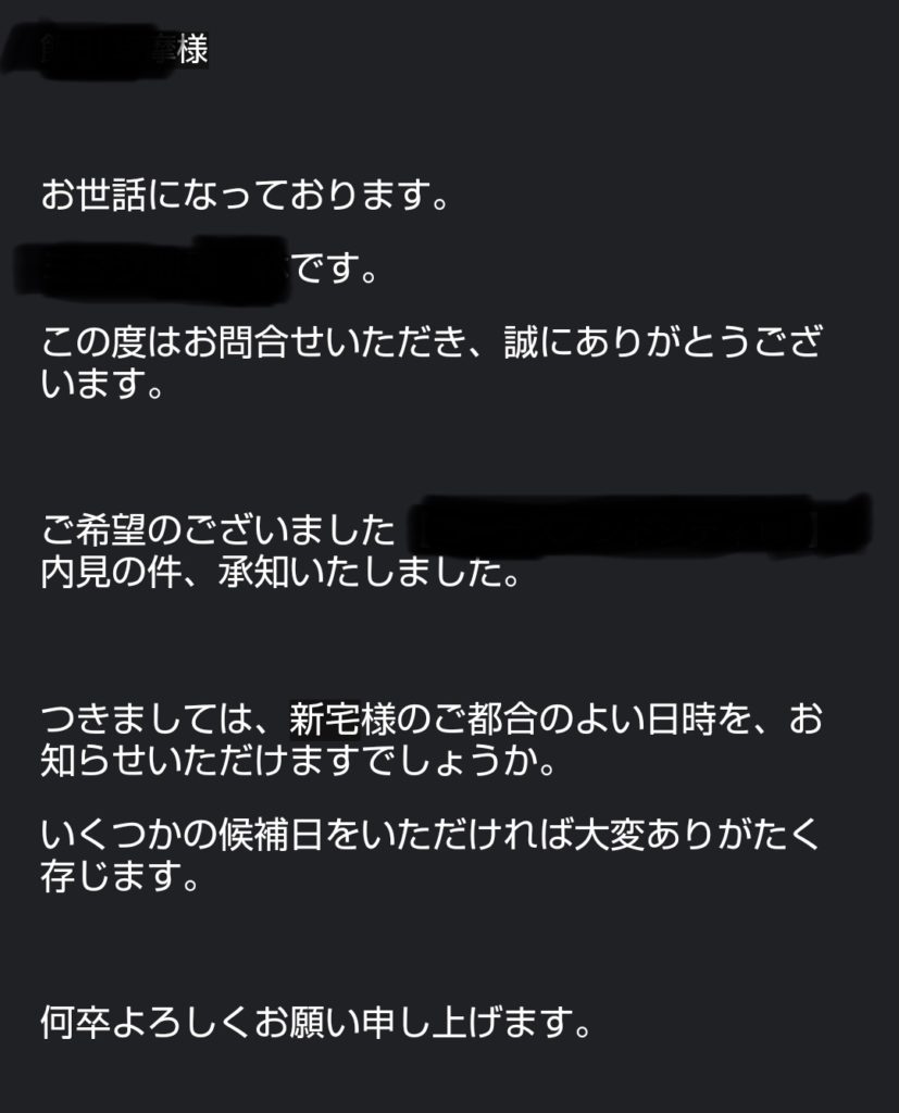 数時間もすれば不動産会社から内見日時の確認メールが届きます。メールのやりとりが苦手であれば電話でも対応してくれました。